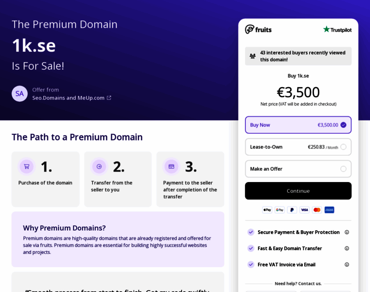 The premium domain 1k.se is for sale on fruits.co. Secure the domain now and start your online success story. Safe payment and quick transfer are guaranteed.
