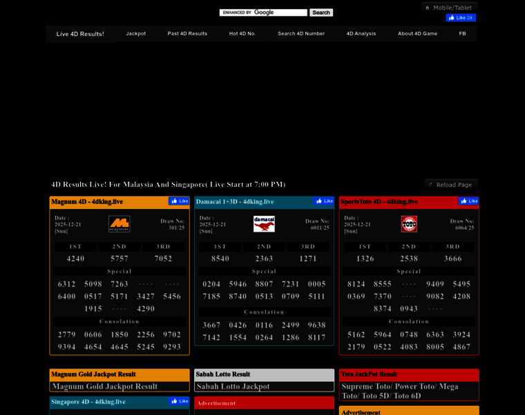 Live 4D Results for Sports Toto, Magnum 4D,Damacai