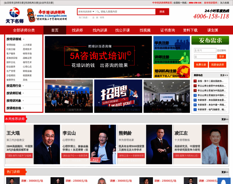 找讲师,培训师就上中华培训讲师网-中国最大的讲师门户网,专业的讲师搜索引擎,一键式企业培训解决方案提供商!网站汇聚数万名优秀讲师,提供培训需求诊断、企业内训、培训整体解决方案、企业大学、培训视频、公开课、资料下载、讲师联系电话公开、讲师推手等专业服务!详询:4006-158-118