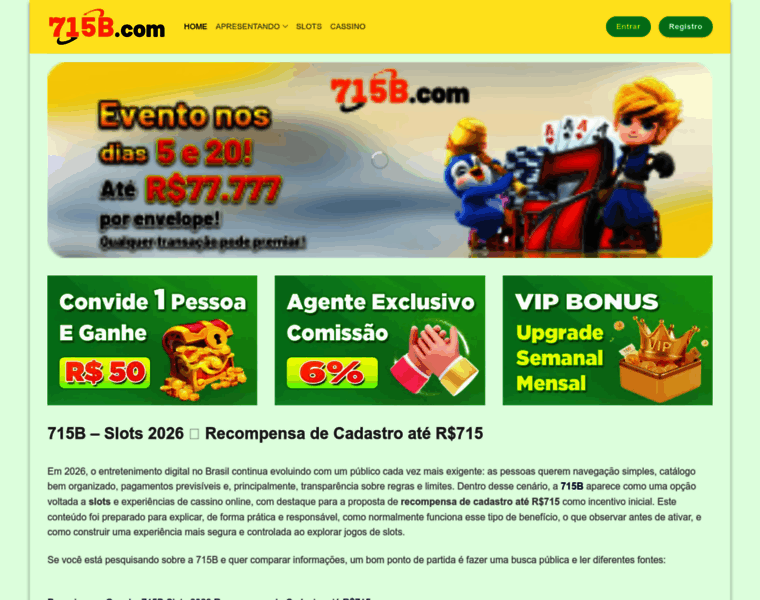 Na 715B 2026, explore slots e cassino online com recompensa de cadastro até R$715. Pagamentos PIX com fluxo ágil, privacidade, segurança de conta e suporte em PT-BR.