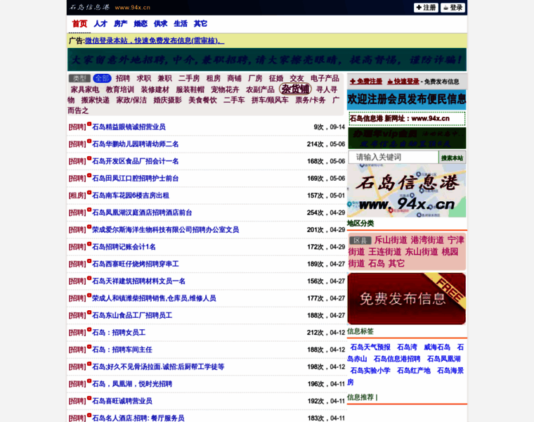 石岛信息港(www.94x.cn)免费发布石岛便民供求生活分类信息,是覆盖石岛招聘、石岛租房、石岛房产、石岛二手房、石岛二手车、石岛征婚、石岛二手等信息的综合性网站。
