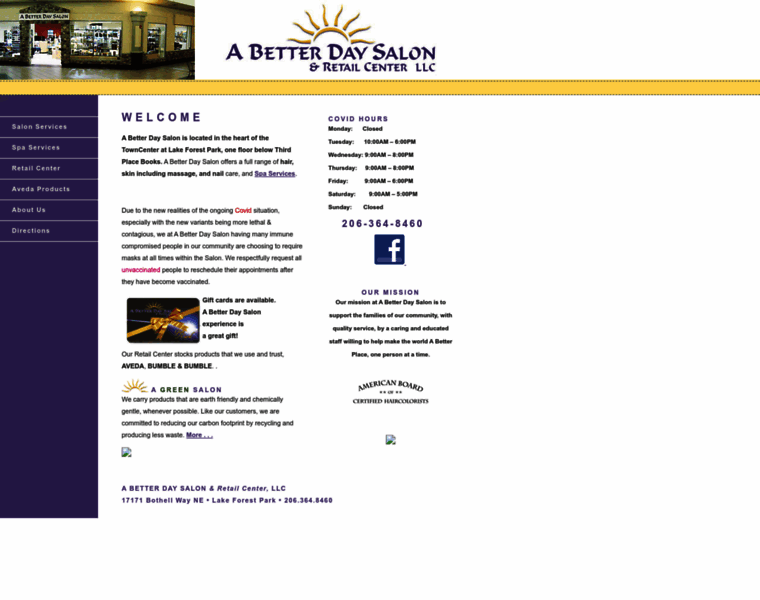 A Better Day Salon is a full-service salon serving men, women and children, located in Lake Forest Park Towne Centre, 17171 Bothell Way NE, Lake Forest Park, WA. Telephone 206-364-8460. Lots of free parking, accessible.