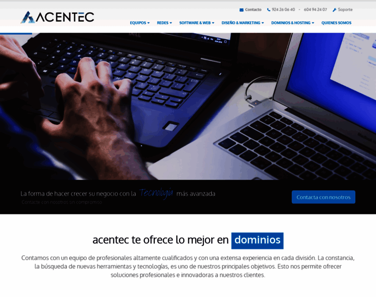La forma de hacer crecer su negocio con la Tecnología más avanzada Contacte con nosotros sin compromiso Contacta con nosotrosacentec te ofrece lo mejor en dominioshostingequiposredesseguridad informáticadiseño webaplicacionescomercio electrónicotrabajos de imprenta Contamos con un equipo de profesionales altamente cualificados y con una extensa experiencia en cada división. La constancia, la búsqueda de nuevas herramientas y tecnologías, es San R...