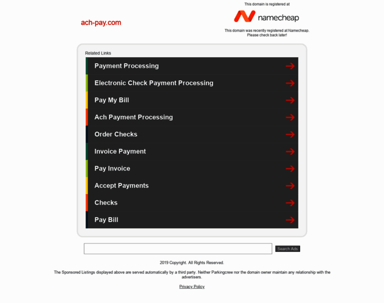 This website is hosted with Amazon Technologies Inc., which reserves the following IP addresses for ach-pay.com: 3.33.130.190, 15.197.148.33. Moreover, DNS used with this website include jm1.dns.com, jm2.dns.com. Subnet identifier ranges from 15.196.0.0 to 15.200.255.255. Classless Inter-Domain Routing (CIDR) is 15.196.0.0/14, 15.200.0.0/16. ARIN net type is Direct Allocation.