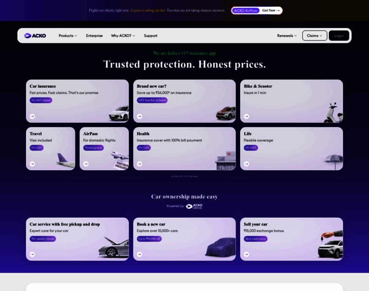 Buy Car, Bike, Health & Travel Insurance online on ACKO. Enjoy zero commissions, paperless claims, and more. Kickstart your insurance journey with ACKO Insurance today | Welcome Change