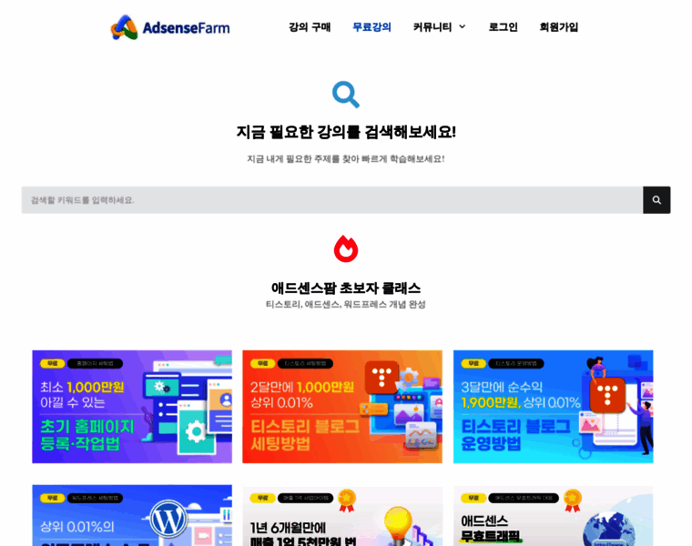 지금 필요한 강의를 검색해보세요! 지금 내게 필요한 주제를 찾아 빠르게 학습해보세요! 애드센스팜 초보자 클래스 티스토리, 애드센스, 워드프레스 개념 완성 애드센스팜 레벨업 코스티스토리, 애드센스, 워드프레스 심화 버전 애드센스팜 전문가 코스애드센스 수익에서 사업화까지 레벨업하세요.