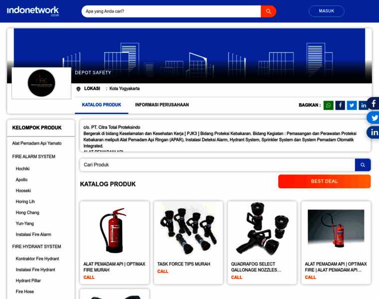 Depot Safety | PT. Citra Total Proteksindo Bergerak di bidang Keselamatan dan Kesehatan Kerja [ PJK3 ]. VISI DAN MISI : Menjadi perusahaan keamanan yang terdepan dalam bidang Suplier Alat Proteksi Keamanan dan Service serta instalatir segala macam peralatan keamanan bidang proteksi kebakaran. Memberikan nilai kepuasan terbaik bagi pelanggan melalui harga terbaik, kompetitif, produk dan pelayanan berkualitas serta garansi yang panjang terjamin mu...