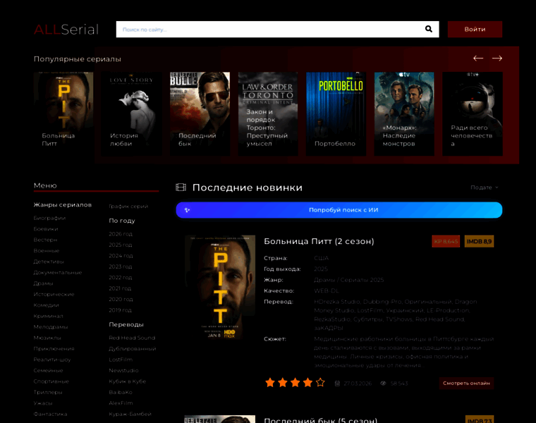 Более 8000 сериалов в хорошем качестве! 3 плеера, субтитры и множество переводов. Смотрите онлайн бесплатно и без регистрации Allserial — удобно и быстро.