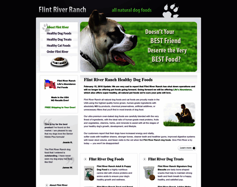 Flint River Ranch dog foods delivered to your door fast and fresh from the Flint River Ranch official site. Flint River dog foods provide the highest quality all natural human-grade ingredients for the ultimate dog health and wellness.
