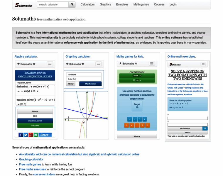 This site offers algebraic and graphical calculators, exercises, and games to practice and solve mathematical problems online.