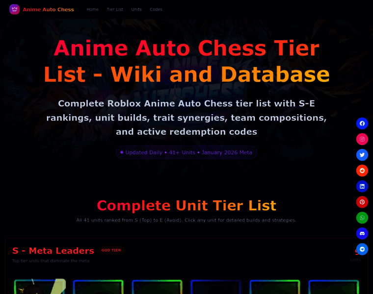 List of all Characters (Units) and Tiers in Anime Auto Chess. Learn about all units ranked S-E and their builds, trait synergies, active codes, and wiki.