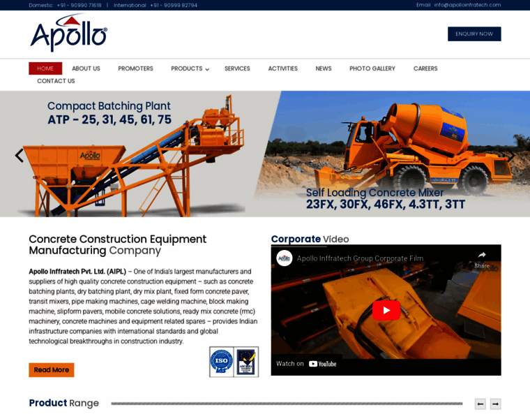 Manufacturers and suppliers of concrete construction equipment, concrete batching plant, pipe/block making machine, transit mixer, ready mix concrete plant (RMC), slipform pavers, cage welding machines and related parts from Apollo Inffratech, a concrete batching solution provider.