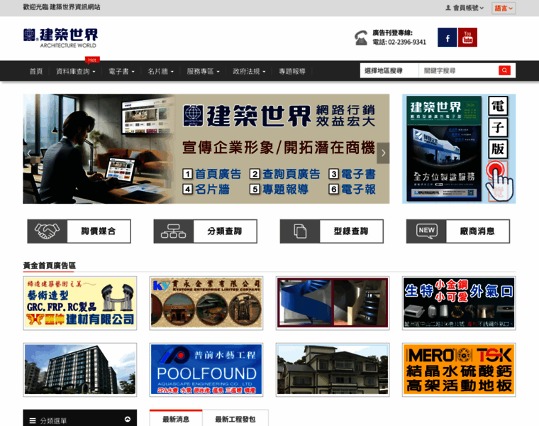 提供建築、土木、營造、裝潢、仲介業、建築建材、營建營造、土木營建、防水隔熱、消防工程、施工機具、景觀育樂、招牌模型、清潔服務、公害環保、室內設計、衛浴設備、機電設備廠商名錄及建材等相關廠商資料、建門企業、建築雜誌、建材雜誌、建材廣告。