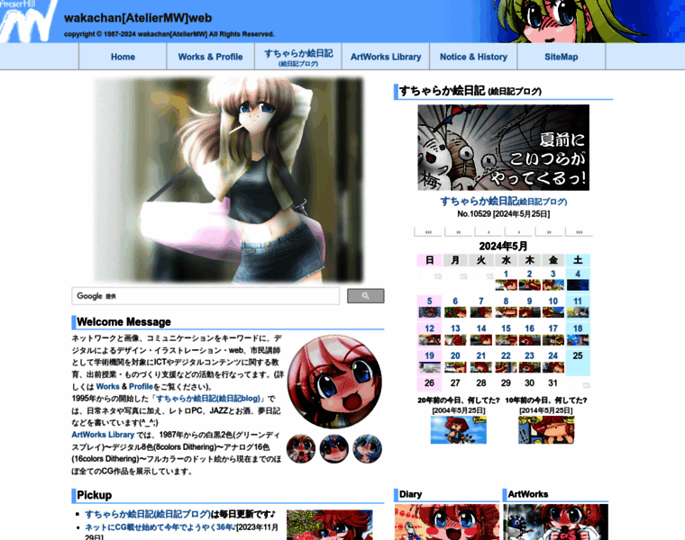 wakachan[AtelierMW]webのトップページです。ネットワークと画像、コミュニケーションをキーワードに、webデザインや画像制作、学術機関を対象にICTやデジタルコンテンツの教育支援などの活動をしています(詳しくは Works & Profileをご覧ください)。1995年からの開始した「すちゃらか絵日記(絵日記blog)」では、日常ネタや写真に加え、レトロPC、JAZZとお酒、夢日記などを書いています(^_^;)ArtWorks Library では、1987年からの白黒2色(グリーンディスプレイ)〜デジタル8色(8colors Dithering)〜アナログ16色(16colors Dithering)〜フルカラーのドット絵から現在までのほぼ全てのCG作品を展示しています。