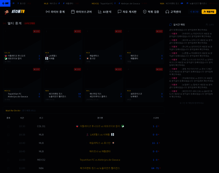 전 종목 실시간 라이브스코어와 AI가 분석하는 정교한 승부 예측 시스템. 축구, 야구, 농구, e스포츠까지 HD 무료 중계와 데이터 기반 승률 예측을 지금 바로 아톰티비에서 경험하세요.
