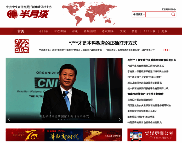 半月谈网,是新华社主办《半月谈》建设的以时事政治,时政热点,时事新闻,时事评论,政策解读,时政新闻要闻为主的大型时政专业平台,相约网上半月谈,与您共话天下事!网站不定期开设专题,就某一重大时政主题进行集纳式报道,最近开设了“十八届三中全会 深化改革新航标”专题,目前已上稿150多篇。此前还开设了“中国梦”、“党的群众路线教育实践活动”等专题。此外,网站还设有媒体集萃、文化、教育、健康、旅游等栏目和频道。