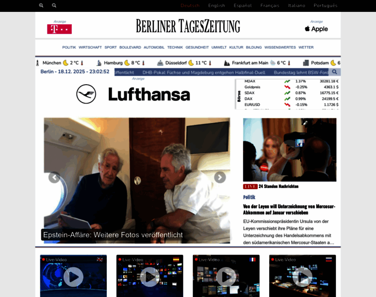 Die BERLINER TAGESZEITUNG bietet Ihnen rund um die Uhr aktuelle Nachrichten in Deutsch, Englisch, Spanisch, Französisch, Italienisch und Portugiesisch. Hier finden Sie Neuigkeiten aus Politik, Wirtschaft, Sport, Technik, Automobile und Boulevard
