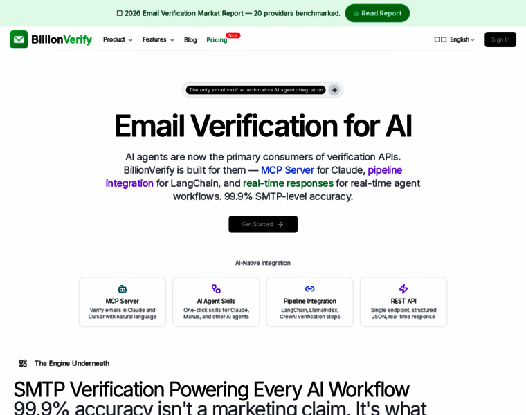 Email verification built for AI agents and workflows. Native MCP Server for Claude, pipeline integration for LangChain, real-time API. 99.9% accuracy.