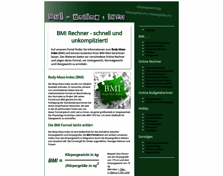Auf bmi-online.info können Sie schnell durch unseren BMI Rechner Ihren BMI berechnen lassen. Des Weiteren finden Sie die BMI Formel und BMI Tabellen.
