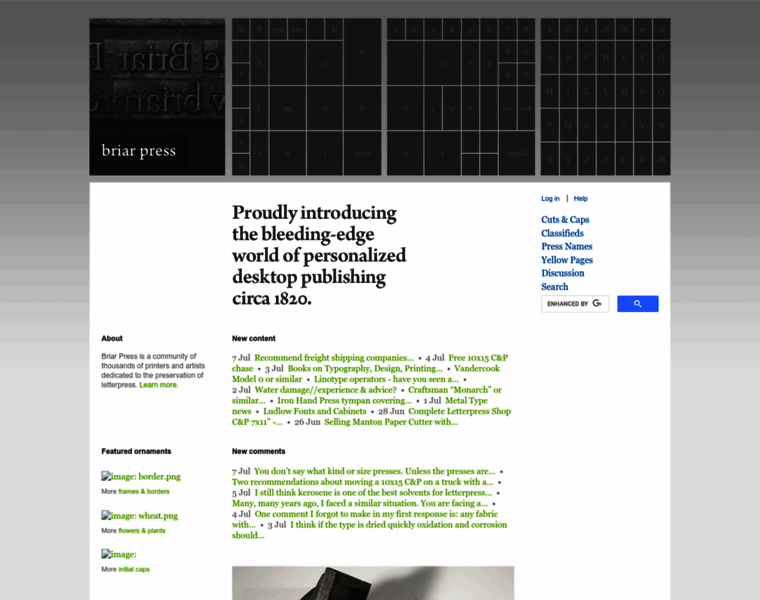 Briar Press: A letterpress community. Museum of Printing Presses, Letterpress Classifieds, Printer's Yellow Pages, and vintage postscript artwork for download.