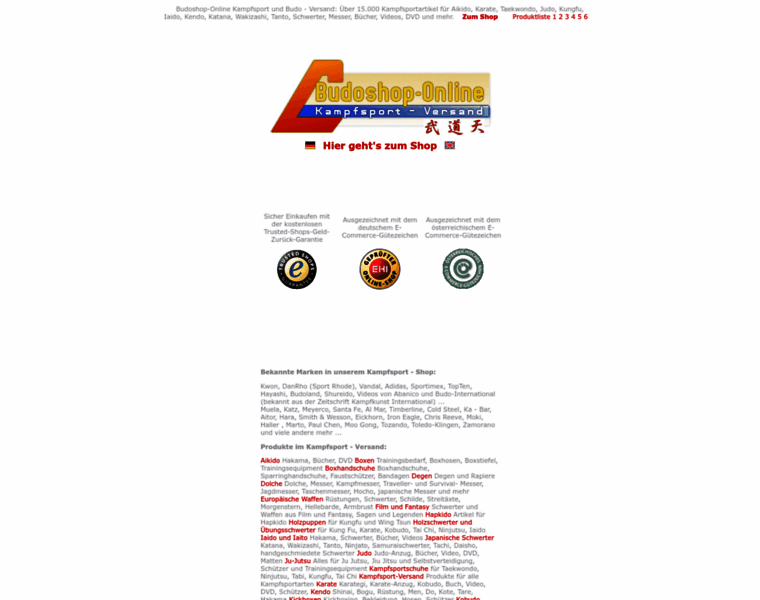 Budoshop-Online Kampfsport und Budo - Versand hat 15.000 Kampfsportartikel für Aikido, Karate, Taekwondo, Judo, Kungfu, Ninja, Kickboxen, Iaido, Kendo, Katana, Wakizashi, Tanto, Schwerter und Messer.