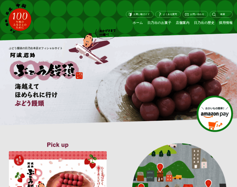 阿波・徳島の名物、ぶどう饅頭で有名な日乃出本店ホームページです。穴吹町の豊かな自然に恵まれた日乃出本店菓子工場にて、吉野川の清らかな水と特製の餡を使い丁寧に蒸しあげたぶどう饅頭や他にもこだわりの材料を使った和菓子をぜひご賞味ください。