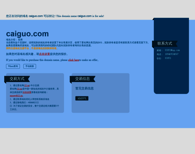 The registrar of caiguo.com is 22net, Inc. and the name expires on 2019-01-15. According to open source data, you can reach the owner at business@caiguo.com but please make sure you have a good reason for unsolicited messages. Their country of residence is China.