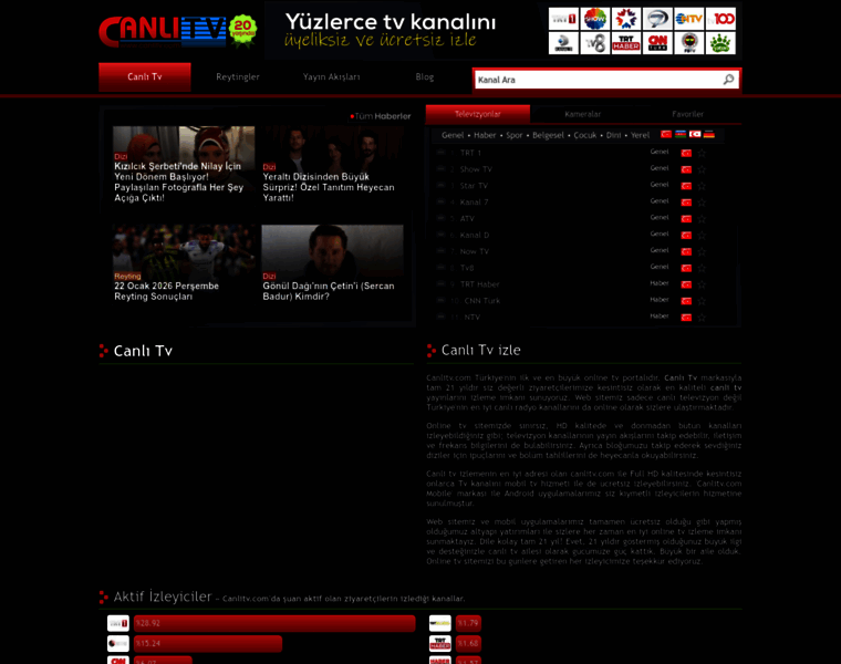 Canlı Tv izle, HD kalitesinde kesintisiz olarak canlı tv kanallarını sitemizden izleyebilir ayrıca tv reytingleri ve yayın akışı bilgilerine ulaşabilirsiniz.