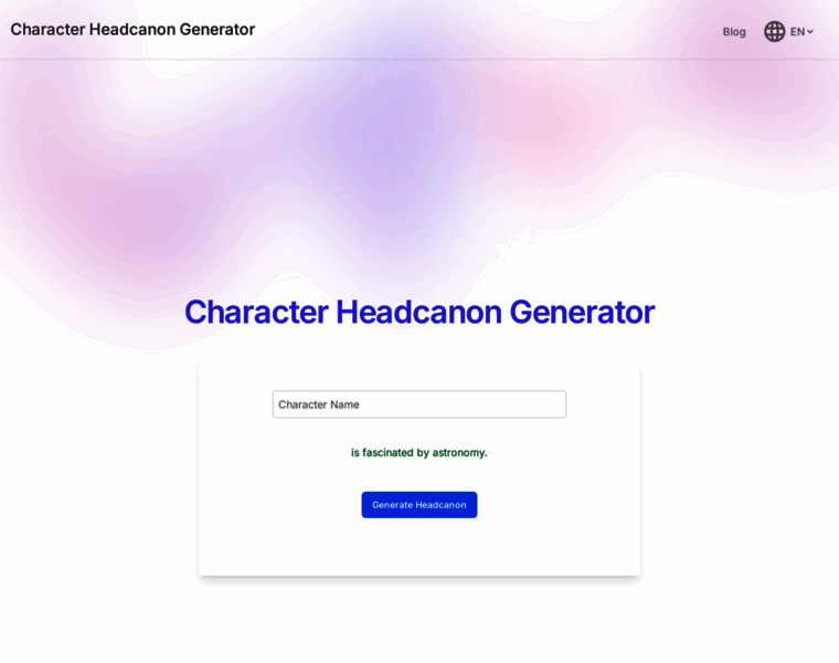 Discover the Character Headcanon Generator, an innovative tool that originated from the Perchance platform. This powerful character headcanon generator helps you create detailed and engaging character headcanon with ease, allowing fans to explore new interpretations of their favorite characters. Whether you're a writer, role-player, or fan fiction enthusiast, our headcanon generator provides endless creative possibilities by generating unique...