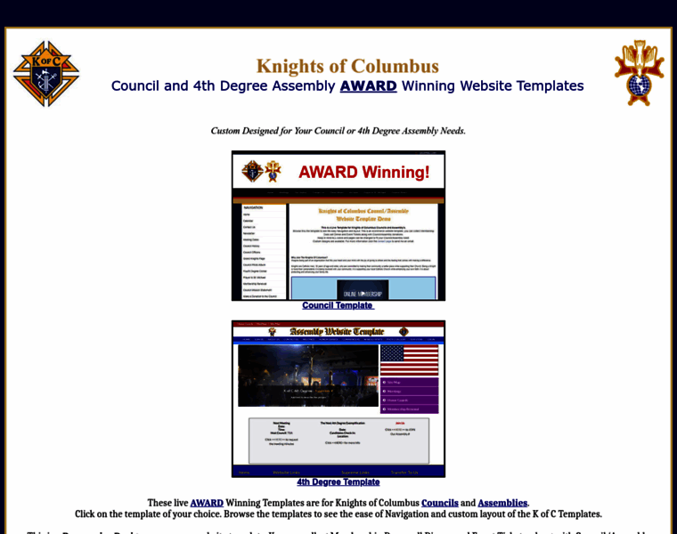 These live AWARD Winning Templates are for Knights of Columbus Councils and Assemblies. Browse the templates to see the ease of Navigation and custom layout of the K of C Templates
