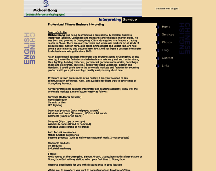 business interpreter,whosalemarket guide,pick-up at air port, English Speaking driver with Car,rent hourse,chinese tutor,baby sisiter,tour guide,sourcing agent in guangzhou,Zhongshan,dongguang,foshan of China.