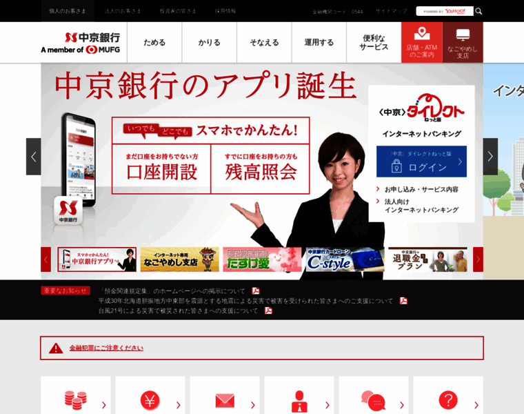 中京銀行のホームページ。ローン、預金、投資信託、保険などをご案内します。インターネットバンキング、インターネット専用なごやめし支店がご利用できます。