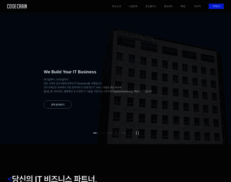We build your IT Business :: 코드크레인은 정확하고 신뢰할 수 있는 IT 파트너로써 PC/Mobile Web, Android, iOS 등 모든 환경에서 최적화된 기술개발 솔루션을 제공합니다. CODECRAIN의 전문가와 함께 IT 서비스의 성공적인 시작을 맞이하세요!