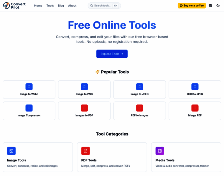 ConvertPilot offers free online tools for image conversion, PDF manipulation, image, media processing, and developer utilities. All processing happens in your browser - fast, private, and secure.