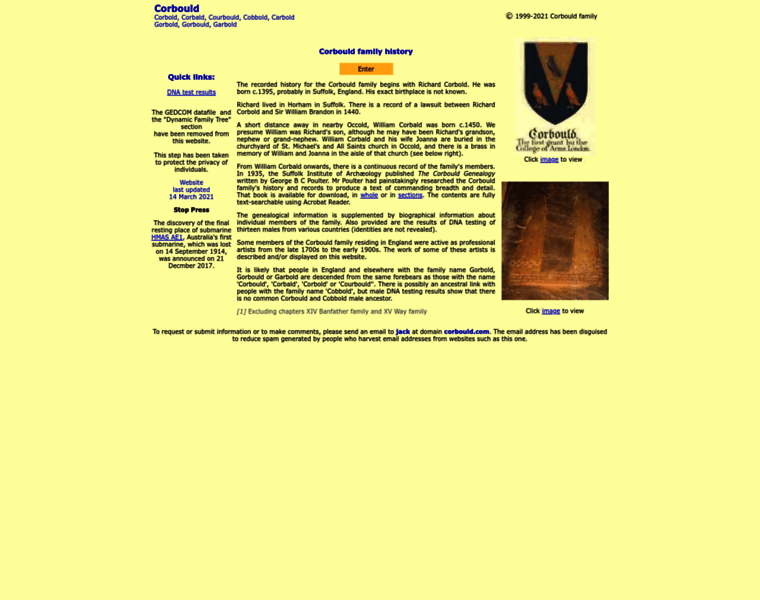 Website containing genealogical records for the Corbould family from c. 1395 beginning in Occold Sussex England. Includes information on recognised Corbould artists and their correspondence.