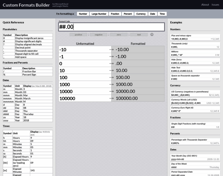 The Custom Formats Builder is an online scratchpad that helps you learn, build, and test custom formats for Microsoft Excel and Google Sheets.