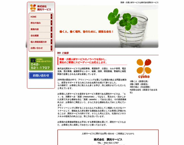 株式会社調光サービスでは、医療・介護人材サービスのノウハウを活かし、病院事務、看護助手、介護士、カルテ管理、電話交換、受付事務、健康医学センター、秘書、清掃、環境整備、警備等と病院関係で必要とされる人材派遣・人材紹介を行っています。