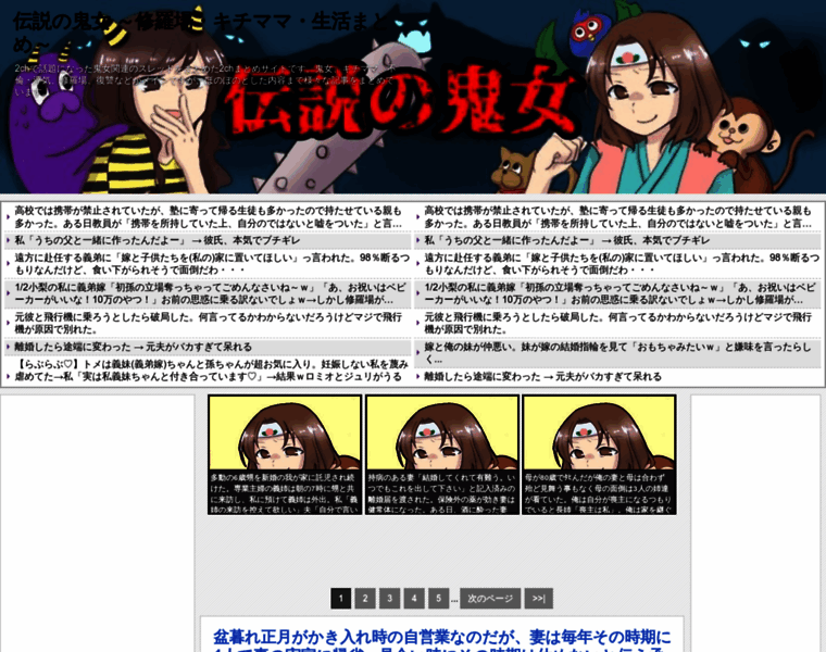 2chで話題になった鬼女関連のスレッドをまとめた2chまとめサイトです。鬼女、キチママ、不倫・浮気、修羅場、復讐などがメインですが、ほのぼのとした内容まで様々な記事をまとめています。