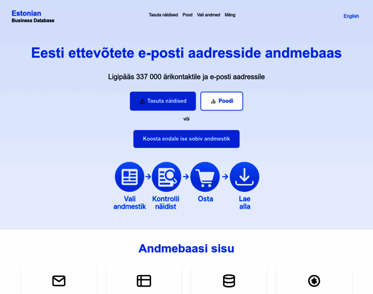 Suurim Eesti ettevõtete e-posti aadresside andmebaas. 337 000+ ärikontakti, regulaarsed uuendused. Ideaalne B2B turunduseks ja müügiks.