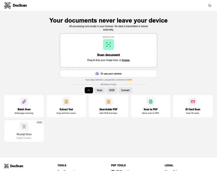 DocScan is a fully in-browser document scanner with OCR and ID card scanning. Scan, crop, enhance and convert documents to PDF without uploading files to any server. Private, instant and free.