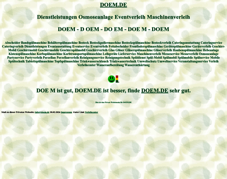 doem, Besteckverleih, Cateringverleih, Eventverleih, Fettabscheider, Geräteverleih, Geschirr-Mobil, Geschirrmobil, Geschirrmobile, Geschirrverleih, Gläserverleih, Leihgeräte, Kistenspülmaschine, Maschinenverleih, Porzellanverleih, Reinigungsservice, Reinigungstechnik, Spüldienst, Spül-Mobil, Spülmobil, Spülmobile, Spülservice, Mobile Spültechnik, Trinkwassertechnik, Umweltschutz, Umweltservice, Veranstaltungsservice, Verleih, Wasseraufbereitung, ...