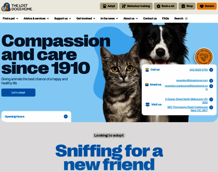 Find your perfect companion at The Lost Dogs' Home. Adopt rescued dogs and cats, support animal welfare, and help us create a better world for pets in need.