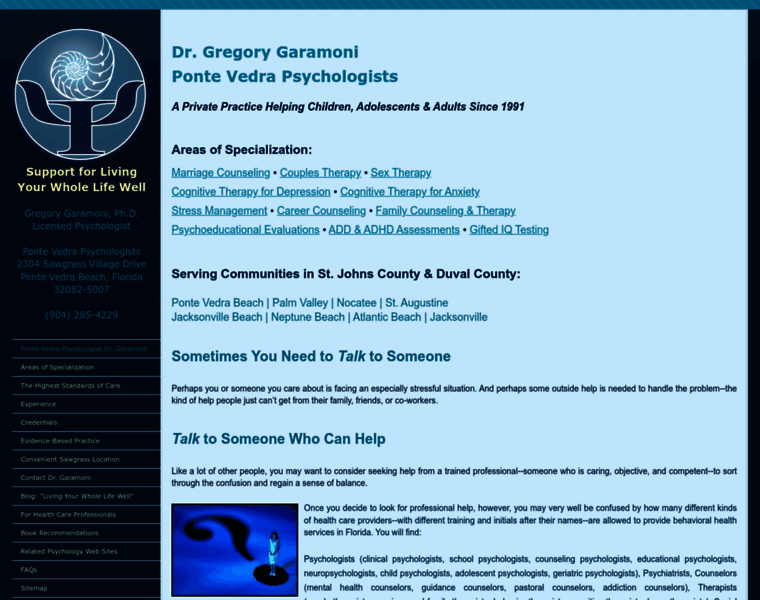 Ponte Vedra Psychologist Dr. Gregory Garamoni has a well-established private practice in Ponte Vedra Beach, providing therapy and counseling for children, adolescents and adults since 1991.