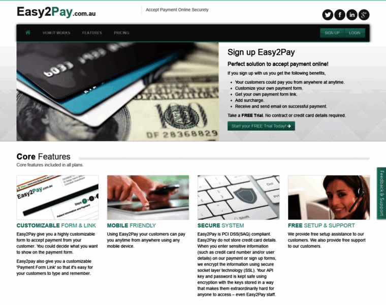 Easy2pay.com.au provides you an online payment page to accept payment from your customers. Easy2Pay.com.au is a easy self subscribe online secure service.