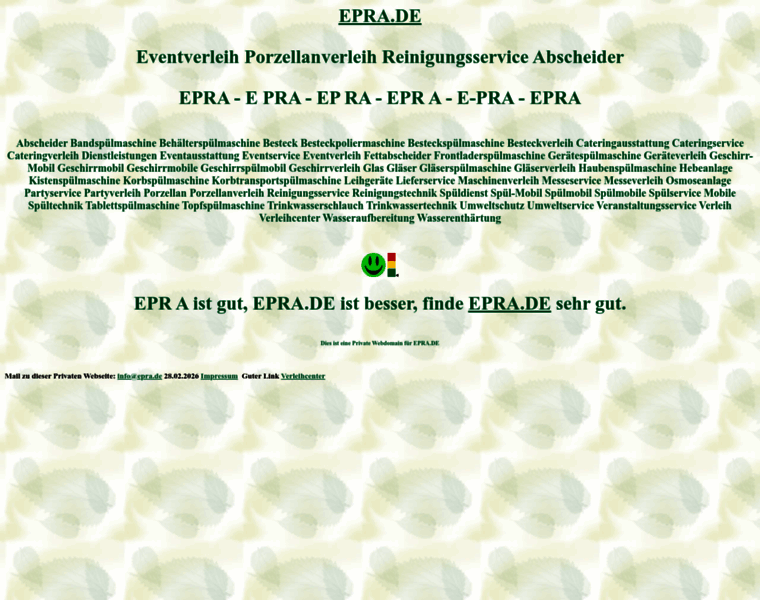 epra, Besteckverleih, Cateringverleih, Eventverleih, Fettabscheider, Geräteverleih, Geschirr-Mobil, Geschirrmobil, Geschirrmobile, Geschirrverleih, Gläserverleih, Leihgeräte, Kistenspülmaschine, Maschinenverleih, Porzellanverleih, Reinigungsservice, Reinigungstechnik, Spüldienst, Spül-Mobil, Spülmobil, Spülmobile, Spülservice, Mobile Spültechnik, Trinkwassertechnik, Umweltschutz, Umweltservice, Veranstaltungsservice, Verleih, Wasseraufbereitung, ...