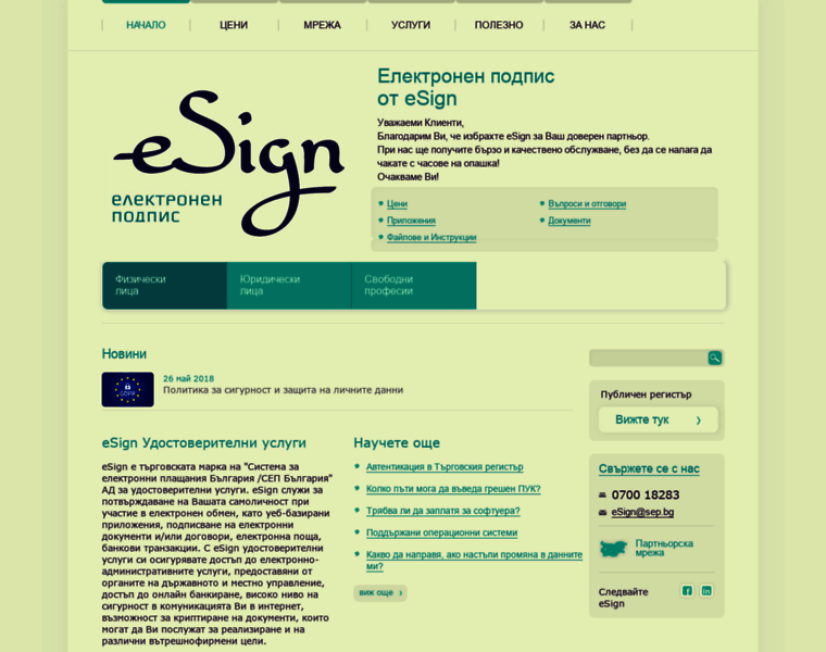 Система за електронни плащания България СЕП България” АД е акредитиран доставчик на удостоверителни услуги, с решение на Комисията за регулиране на съобщенията (КРС) на 17.07.2008г. „eSign” предоставя удостоверителни услуги, които дават допълнителни средства за сигурност на вашата електронна самоличност! „eSign” ви осигурява достъп до набор от нови електронни услуги на „Система за електронни плащания България СЕП България” АД и партньорите на ком...