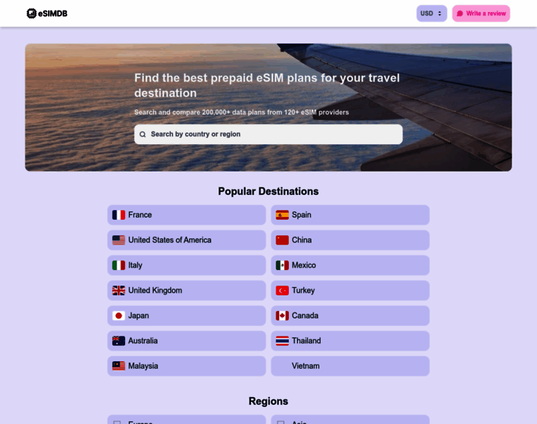 With 120+ eSIM brands and over 200,000 data plans, eSIMDB is the world's largest travel eSIM comparison site. Filter by country or region, read user reviews, and find exclusive discount codes for your trip.