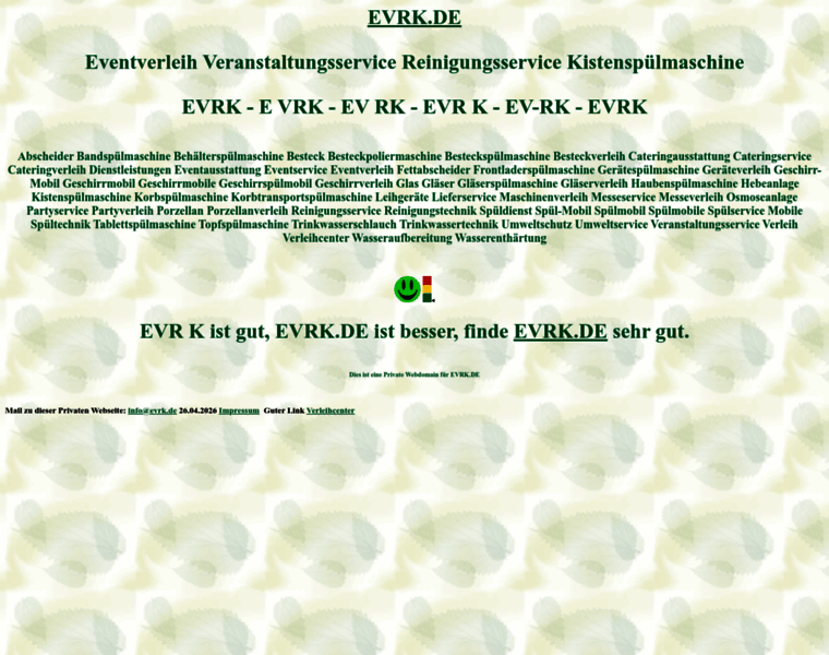 evrk, Besteckverleih, Cateringverleih, Eventverleih, Fettabscheider, Geräteverleih, Geschirr-Mobil, Geschirrmobil, Geschirrmobile, Geschirrverleih, Gläserverleih, Leihgeräte, Kistenspülmaschine, Maschinenverleih, Porzellanverleih, Reinigungsservice, Reinigungstechnik, Spüldienst, Spül-Mobil, Spülmobil, Spülmobile, Spülservice, Mobile Spültechnik, Trinkwassertechnik, Umweltschutz, Umweltservice, Veranstaltungsservice, Verleih, Wasseraufbereitung, ...