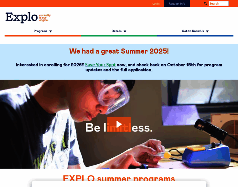 EXPLO is an immersive summer program for middle schoolers ages 12-14. 2 weeks. Residential or day. Limitless options. All you.
