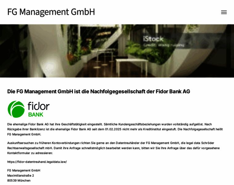 Die FG Management GmbH ist die Nachfolgegesellschaft der Fidor Bank AG Die ehemalige Fidor Bank AG hat ihre Geschäftstätigkeit eingestellt. Sämtliche Kundengeschäftsbeziehungen wurden vollständig aufgelöst. Nach Rückgabe ihrer Banklizenz ist die ehemalige Fidor Bank AG seit dem 01.02.2025 nicht mehr als Kreditinstitut eingestuft. Die Nachfolgegesellschaft heißt FG Management GmbH. Auskunftsersuchen zu